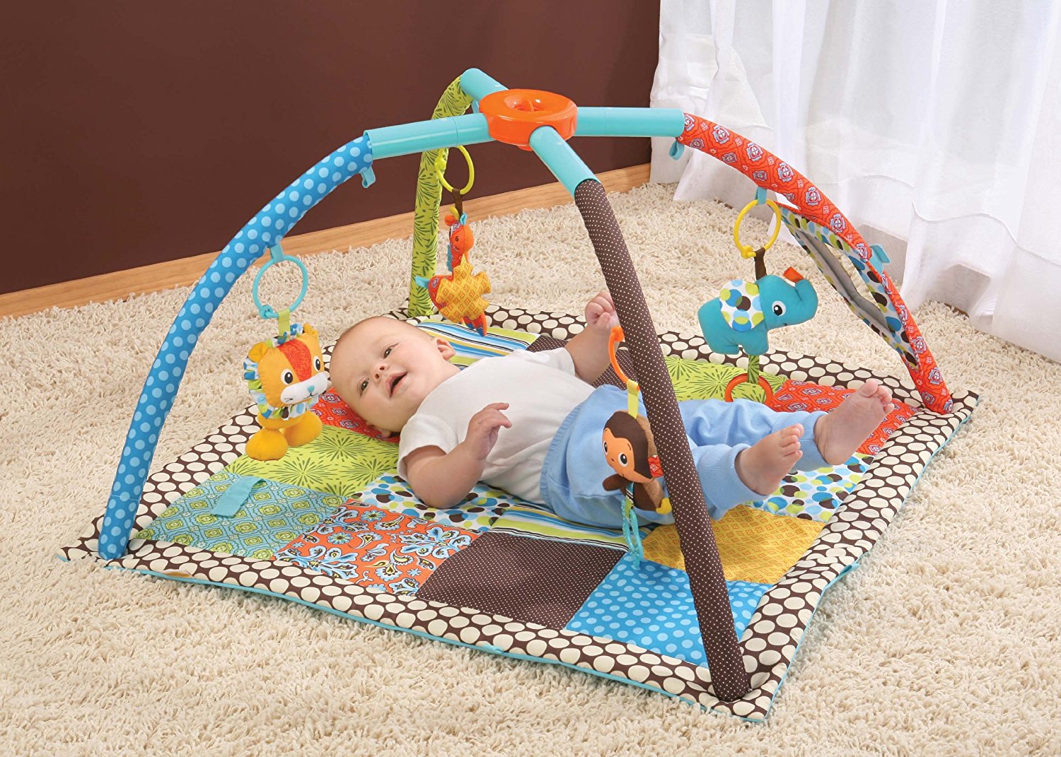 Rotaļu paklājiņš – laba iespēja radīt ap bērnu spilgtu pasauli, pilnu brīnumainām un noderīgām lietām. Izvēloties paklājiņu, jāorientējas uz tā izmēriem un rotaļu paneļa iespējām. Маzuļiem līdz pusgada vecumam rotaļām nav nepieciešams daudz vietas, tādēļ šim paklājiņam nav jābūt pārāk lielam. Ja vēlaties, lai jūsu dāvana tiktu izmantota ilgāk, izvēlieties transformējamu paklājiņu, kurš ir saliekams un aug līdz ar bērnu. Dažiem paklājiņu modeļiem ir speciālas apmales, kuras var pacelt vai nolaist, izveidojot bērnam drošu mini manēžu. Vēlams, lai uz rotaļu paneļa būtu košas rotaļlietas, zobu iznākšanu stimulējoši priekšmeti, spogulīši, grabuļi un citi attīstoši elementi, kuri it tik svarīgi vizuālajai un taustes uztverei pirmajā dzīves gadā. Ir arī paklājiņi ar noņemamiem papildus lokiem, uz kuriem var uzkarināt jaunas rotaļlietas, kā arī piestiprināt pie gultas malām. Šāda dāvana palīdzēs māmiņai izbrīvēt nedaudz laika, kamēr mazulis guļ uz paklājiņa, patstāvīgi spēlējoties un attīstoties.