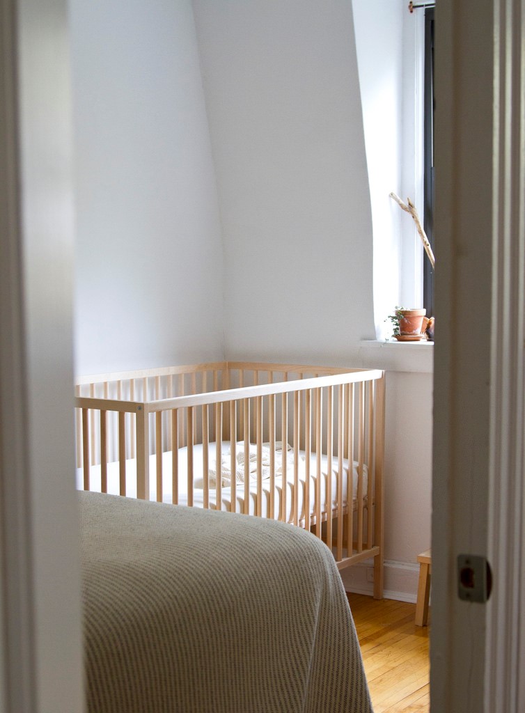 Pirmos mēnešus būs ērtāk, ja novietosiet bērna guļamistabu līdzās vecāku gultai. Tad mamma jebkurā brīdī varēs piekārtot segu vai noglāstīt mazuli naktī, neceļoties no gultas. Tāpēc pirmā gultiņa ir jāizvēlas tāda, kurai viegli nolaižama viena no sienām un vidū izņemamas vairākas līstes.